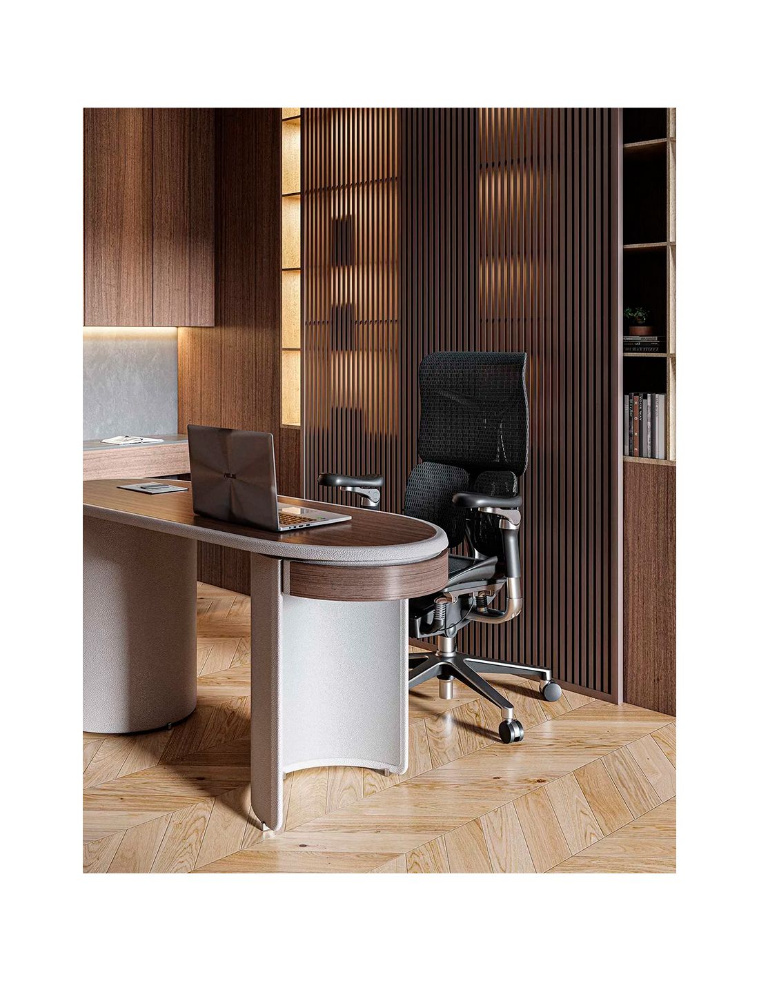 - Інтегрована спинка та підголівник які можна регулювати по висоті. Такий дизайн забезпечує природну підтримку голови, шиї, плечей і спини, створюючи відчуття м’якого та легкого обгортання. Інтегрований дизайн дозволяє рівномірно підтримувати всю верхню частину тіла, сприяючи правильній поставі.