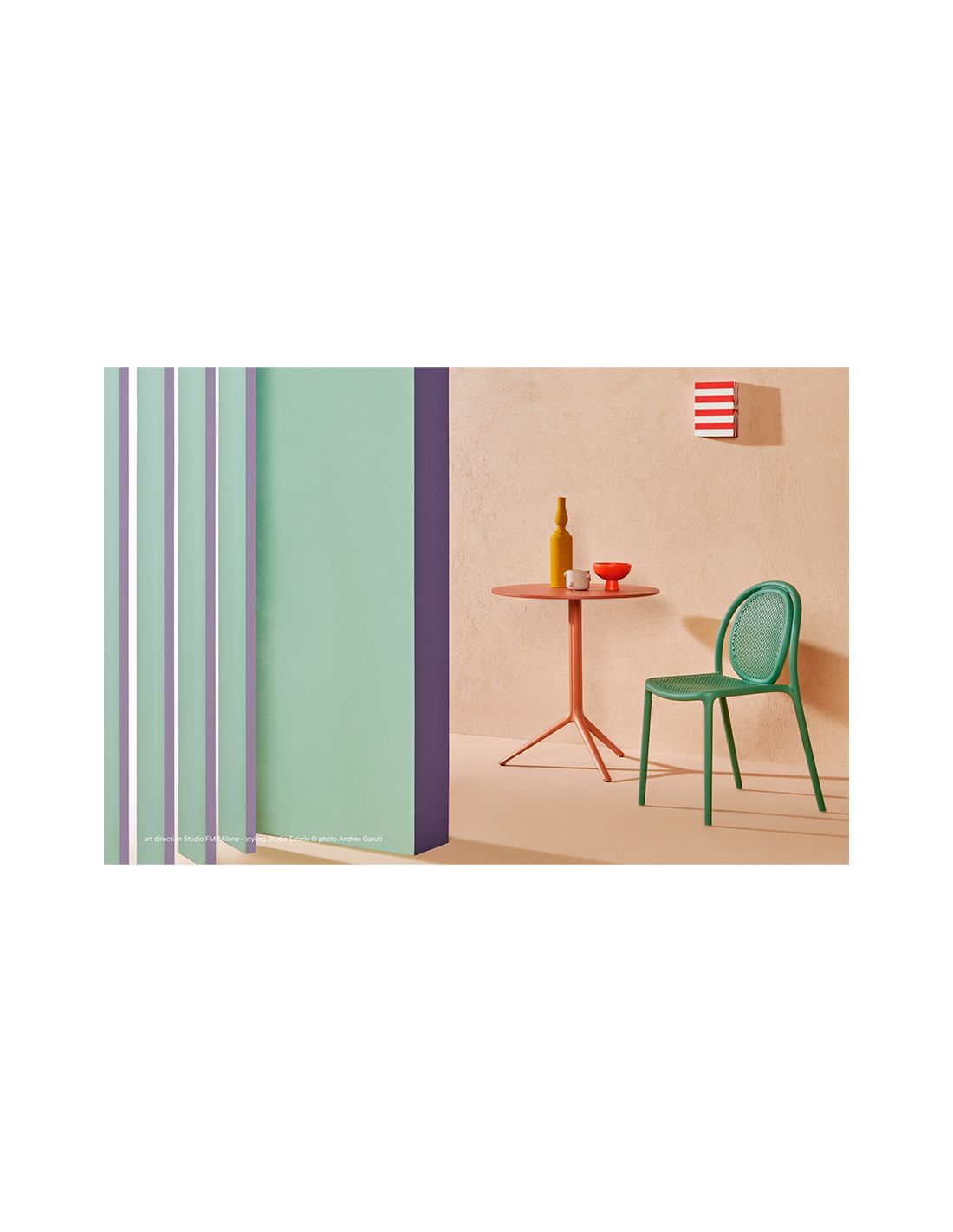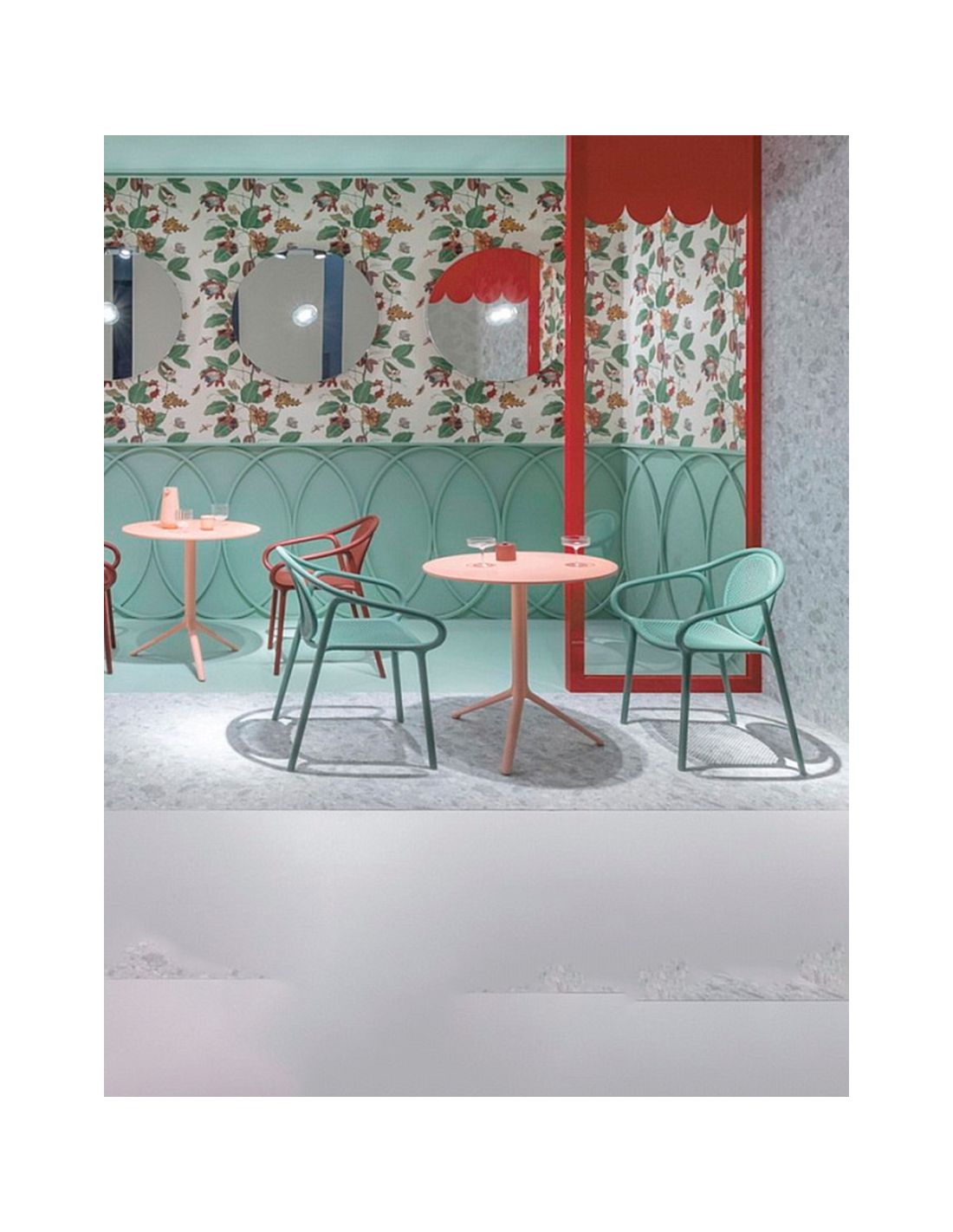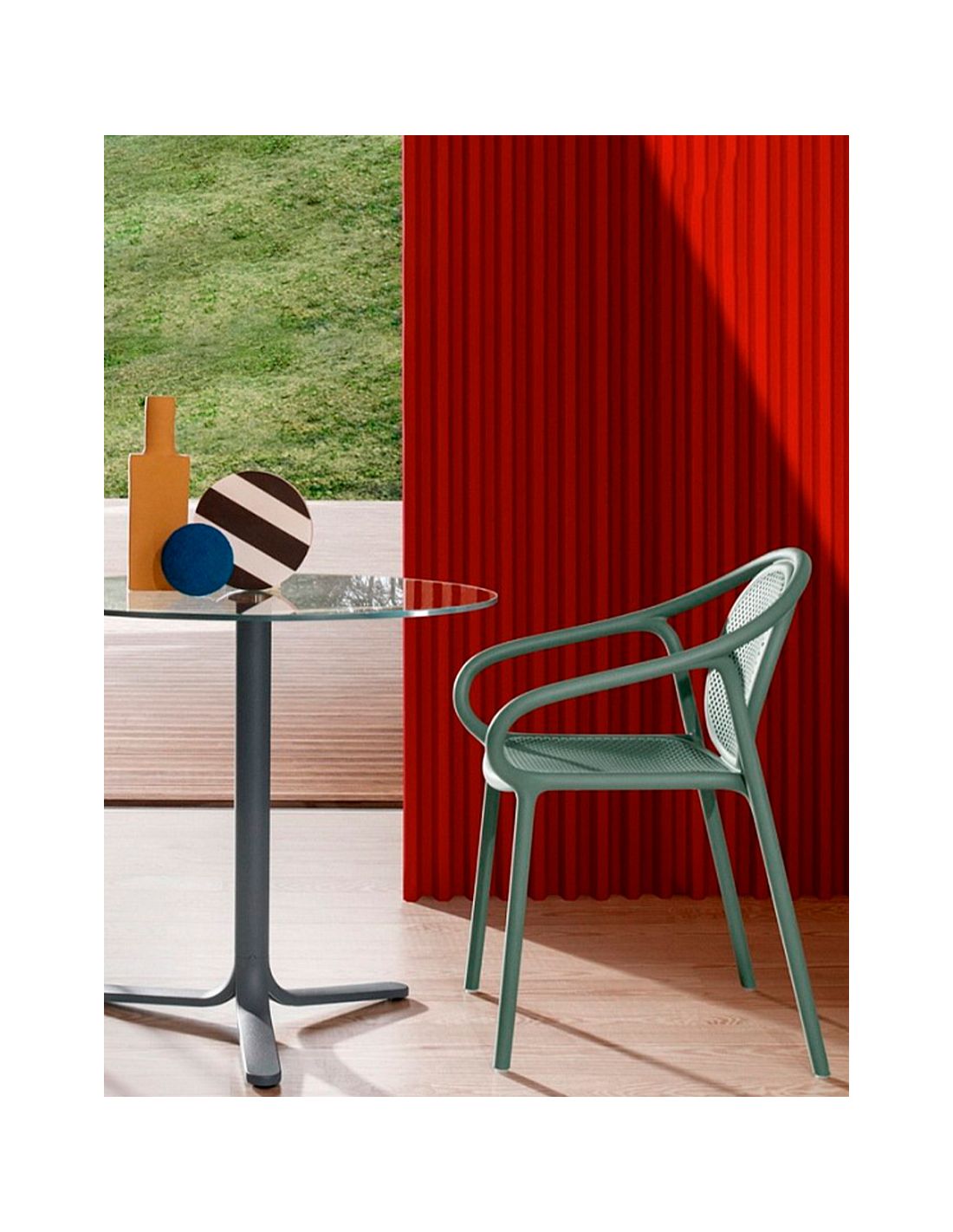 Країна: Італія. Дизайн: Eugeni Quitllet. Стілець широкого застосування. Підходить як для внутрішнього, так і для зовнішнього використання. Стілець для кафе, барів, ресторанів біля води, спа-салонів. Може використовуватися на будь-якій терасі, в саду. Міцний, легкий, стійкий до ударів та вологи. Дихаюче сидіння і спинка роблять його повітряним і забезпечують комфорт. Матеріал: литий поліпропілен, посилений скловолокном. Модель з підлокітниками. Стілець може поставлятися в різних кольорах. Максимальне навантаження: 120 кг. Гарантія: 3 роки.